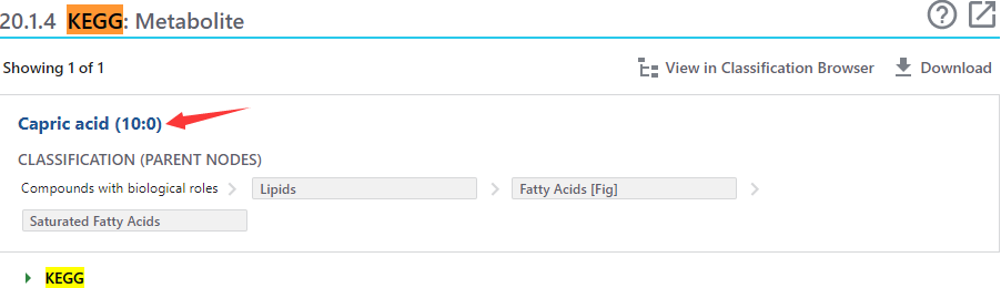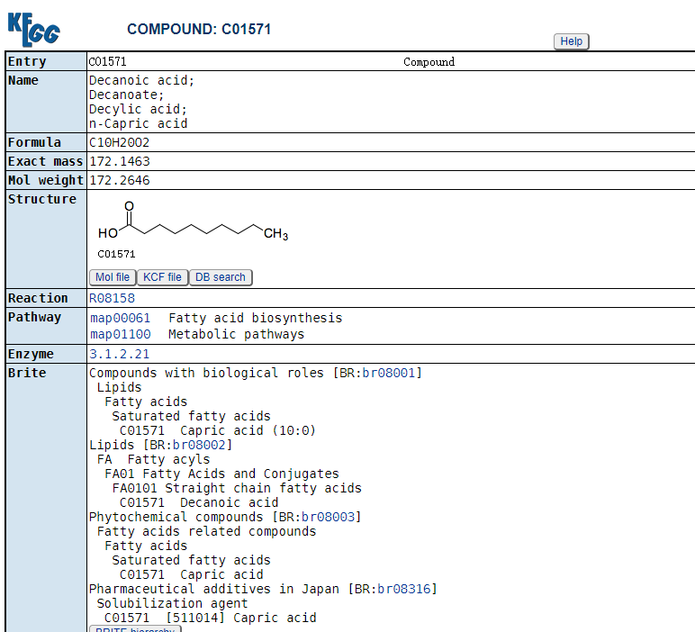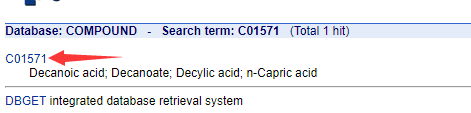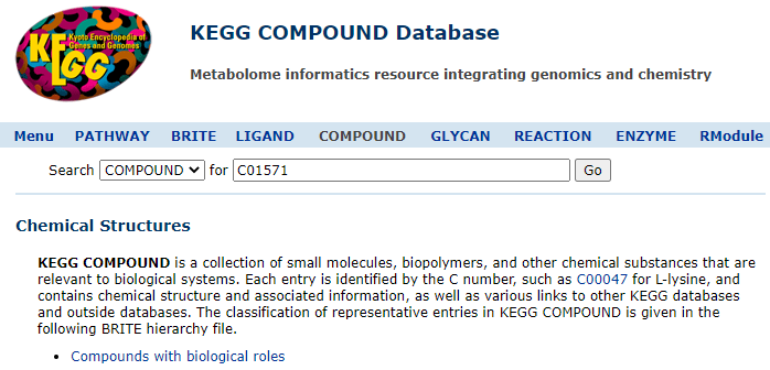 前文提到的KEGG(https://www.genome.jp/kegg/compound/)數(shù)據(jù)庫相信大家都不陌生,它是日本京都大學(xué)和東京大學(xué)聯(lián)合開發(fā)的數(shù)據(jù)庫。它有一個(gè)化合物庫,記錄了與通路相關(guān)的化合物,其化合物ID以C開頭,百邁客的分析結(jié)果提供了這個(gè)信息。這里我們將上述得到的C01571進(jìn)行檢索: