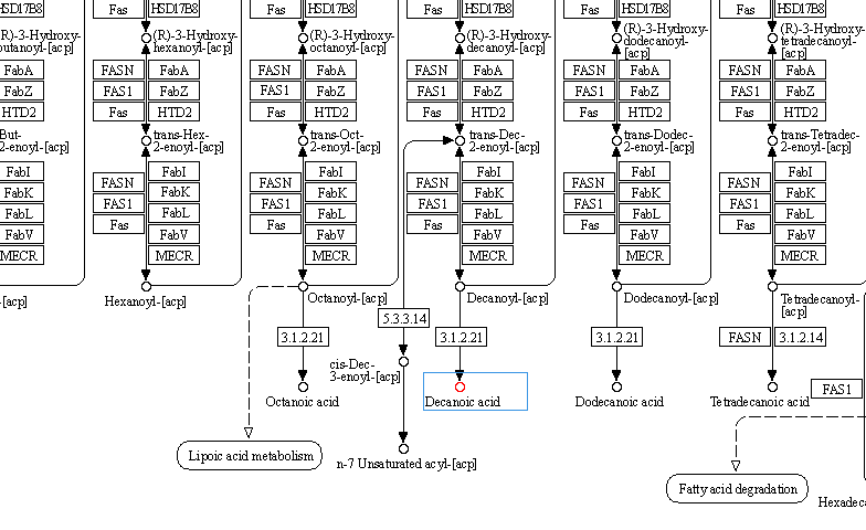 點(diǎn)擊結(jié)果(上圖箭頭)就可以看到具體代謝物的信息,表格中展示了名稱、分子式、結(jié)構(gòu)、化學(xué)反應(yīng)、通路、酶等多種信息,查看通路信息可知道其參與了脂肪酸合成,點(diǎn)擊通路map00061可跳轉(zhuǎn)查看其在通路圖中的具體位置。