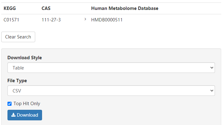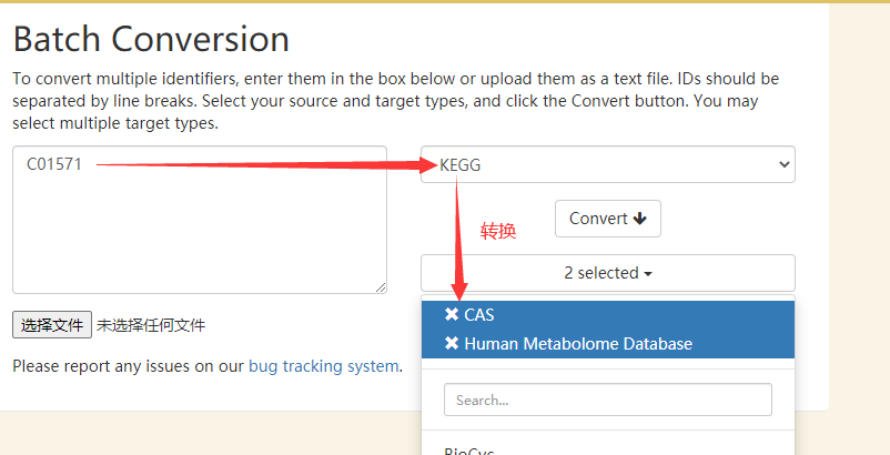 通過前面的檢索頁面我們會發(fā)現(xiàn)相同的代謝物在不同數(shù)據(jù)庫的ID不一樣,不要慌,小編給大家推薦一個(gè)好用的ID轉(zhuǎn)換網(wǎng)站:http://cts.fiehnlab.ucdavis.edu/batch。這個(gè)網(wǎng)站支持多種數(shù)據(jù)庫,而且可以批量哦!。以C01571(類型為KEGG)為例,查詢其CAS和HMDB信息,見下圖:
