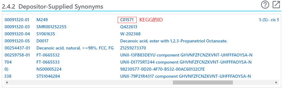 接下來,我們可能想找到這個(gè)化合物對應(yīng)的KEGG注釋信息,這里介紹兩種快速簡單的方法:一種是點(diǎn)擊右側(cè)導(dǎo)航欄的Names and Identifiers(一般是第二項(xiàng)),在跳轉(zhuǎn)地方找到Depositor-Supplied Synonyms(可使用Ctrl+F輸入關(guān)鍵詞搜索)同義詞列表,了解KEGG數(shù)據(jù)庫的熟手可以一眼找到對應(yīng)的KEGG ID為C01571。