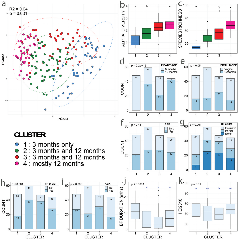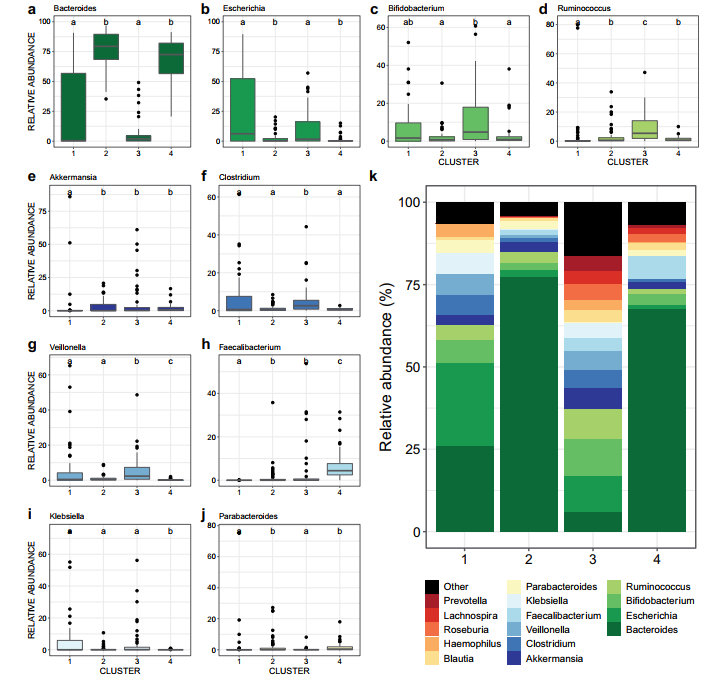 基于微生物群落組成,嬰兒糞便樣品聚類成四組(圖1-2)。腸道細菌物種豐富度(圖1b)、alpha(圖1c)、beta(圖1a)和分類學組成(圖2)在clusters之間存在差異,反應了顯著的菌落差異。Cluster1僅包含了3個月的樣本、cluster4幾乎包括所有12個月的樣本,cluster2和3由3個月和12個月的樣本混合組成。Cluster3包括較高比例的分娩時期使用抗生素的母親、剖腹產出生的嬰兒和配方奶粉喂養(yǎng)(圖1)。然而,在不同clusters中母親ASB消耗量沒有差異,這表明這種暴露并不影響clusters的分類(圖1f)。
