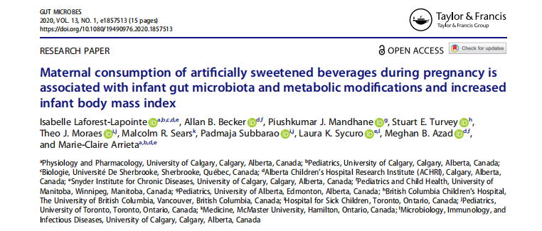 中文名稱:孕婦在懷孕期間飲用人工加糖飲料與嬰兒腸道微生物群、代謝改變和嬰兒體重指數增加有關