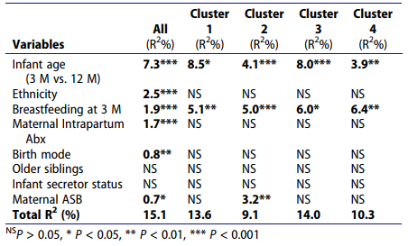 接下來,作者對不同cluster進行了beta多樣性分析。Envfit單變量模型為每個cluster確定了不同的驅動因素(圖3a)。Cluster1中beta多樣性的驅動因素主要是母親因素,而cluster4的驅動因素主要是嬰兒因素(圖3a)。Cluster2是唯一的母親ASB攝入與beta多樣性相關,單變量分析和多變量分析均得到證實(圖3a和表2)。