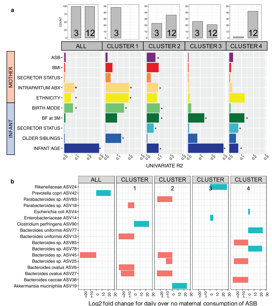 Envfit分析(單變量模型)確定了13個變量作為腸道細菌多樣性的重要驅動因素,從中我們選擇了8個非冗余變量來構建我們的模型:嬰兒年齡、母親生產時使用抗生素、母親的種族、分娩方式、3個月時母乳喂養(yǎng)狀況、是否有兄弟姐妹、嬰兒分泌物狀況和母親的ASB消耗量(圖3a)。完整的數據集中顯著的預測因素是嬰兒的年齡、母親的種族、生產時使用抗生素和分娩方式。同樣的四個變量加上3個月時母乳喂養(yǎng)狀況,在一個多變量模型中進行了測試,解釋了14.2%群落變異(表2)。僅在多變量模型中,母親食用ASB是嬰兒腸道細菌組學的顯著預測因子(表2)。分娩方式、生產時抗生素和3個月時母乳喂養(yǎng)狀況也對群落組成有顯著影響,但低于嬰兒年齡和母親種族(表2)。