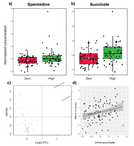 使用MetaboAnalyst軟件確定了20種不同的代謝物。由于代謝組中的功能特征反應了微生物代謝的冗余性,并且不太容易受到分類學數據集典型個體間差異的影響,作者測試了3個月和12個月時母親ASB消耗量對完整數據顯著的影響。兩種尿液代謝物亞精胺和琥珀酸在暴露于ASB的3個月嬰兒中顯著升高(圖4)。