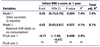 最后,在完整數據集上使用一個多變量線性模型,作者測試了母親ASB消耗量、微生物群落組成、與高ASB消耗量關聯的兩種代謝物與1歲嬰兒BMI z-score間的關系。此隊列中嬰兒出生時體重與一歲時的BMI沒有相關性。然而,多變量線性模型證實母親ASB日消耗量與嬰兒較高的BMI相關,并表明BMI與12個月時微生物組成有關但與3個月時無關(表3)。值得注意的是,琥珀酸與BMI呈正相關,與亞精胺無關,表明這種關聯也可能涉及微生物來源的代謝物(表3和圖4d)。