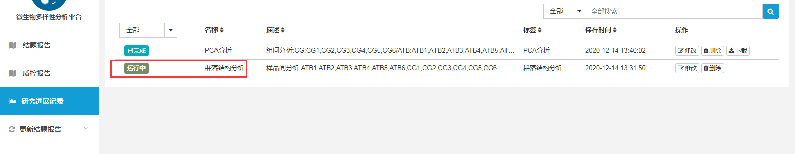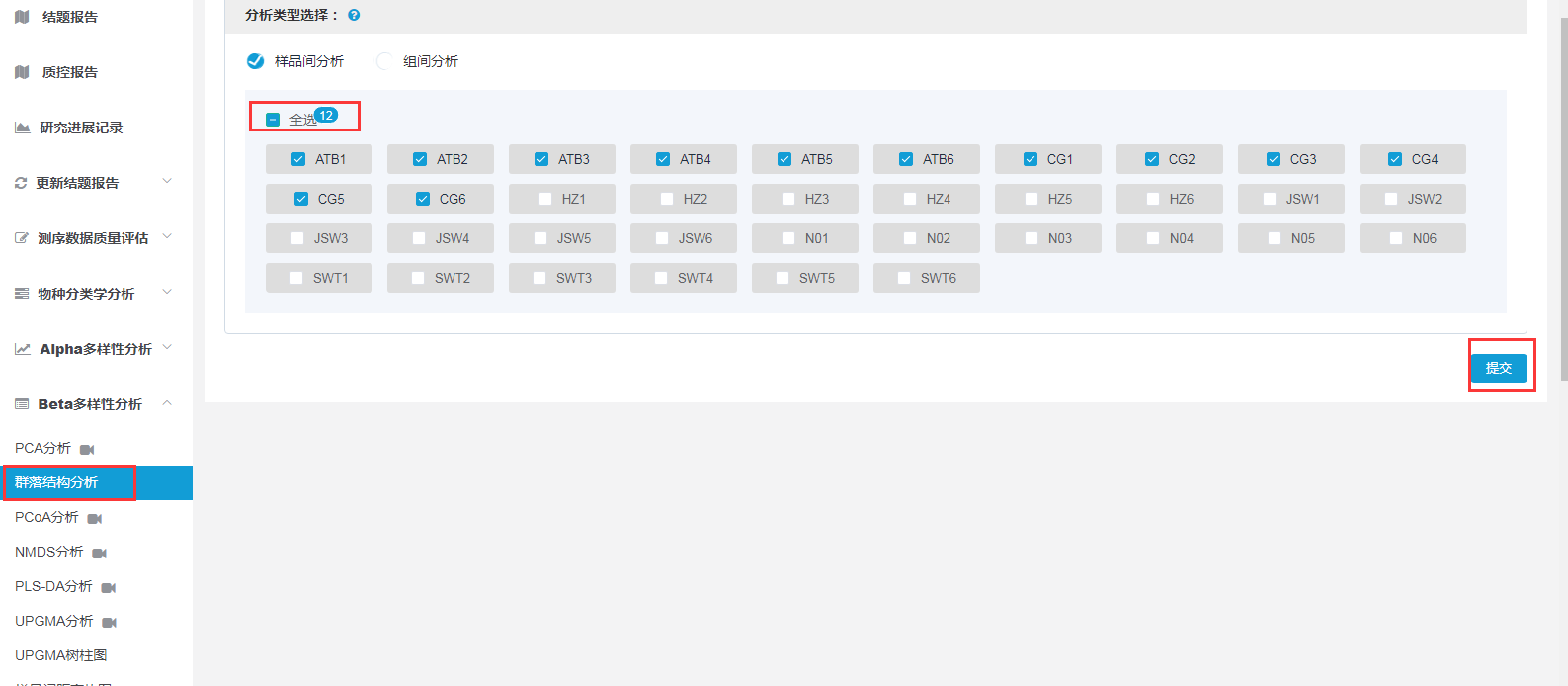 云平臺上關(guān)于群落結(jié)構(gòu)分析的操作非常簡單,打開結(jié)題報告后點擊“Beat多樣性分析”中的群落結(jié)構(gòu)分析,選中需要分析的樣品點擊提交,然后可以在分析記錄界面查看分析結(jié)果(由于會做999次重復(fù)計算,大家耐心等待哦)。