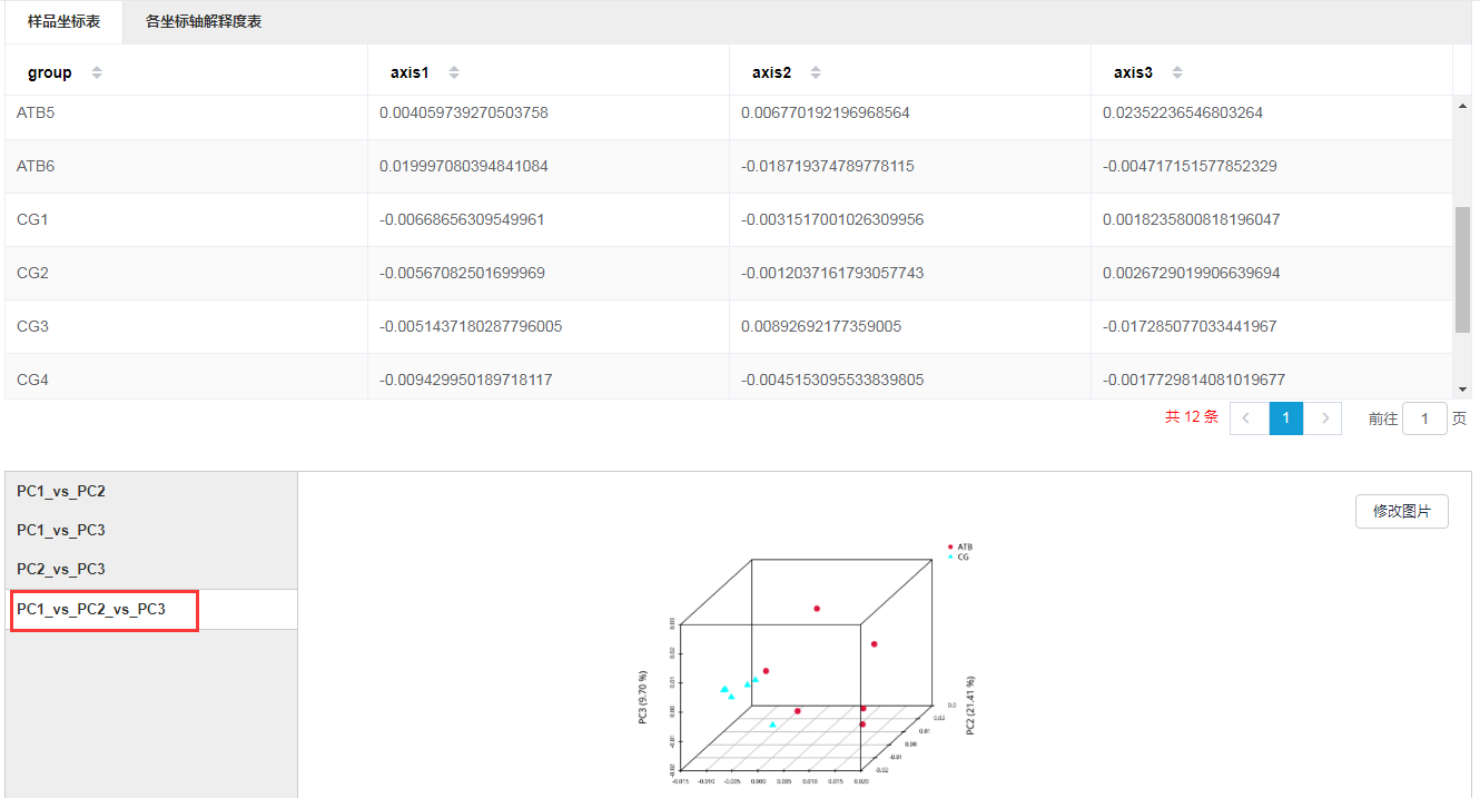 PCA/PCoA分析通常使用第一軸和第二軸的信息展示樣品或者分組之間的聚集和差異,當(dāng)?shù)谝惠S和第二軸不足以展示組間差異時,我們可以通過三維圖查看前3軸對樣品間差異的影響。打開結(jié)題報告后點擊“Beat多樣性分析”中的PCA分析或者PCoA分析,選中樣品或者分組,提交任務(wù)后會顯示三維分析結(jié)果。