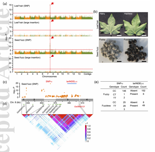 Wang X, Miao Y, Cai Y, et?al. Large-fragment insertion activates gene GaFZ?(Ga08G0121), and is associated with the fuzz and trichome reduction in cotton (Gossypium arboreum). Plant Biotechnol J. 2020 Dec 28.