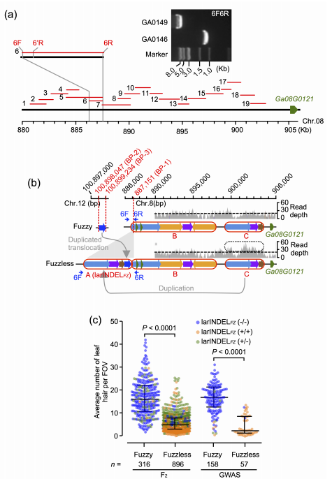 為了驗證插入片段larINDELFZ,作者利用19個重疊引物在具有代表性的短絨和無絨材料(GA0146和GA0149)中進(jìn)行序列分析,發(fā)現(xiàn)短絨材料中有一個大小為6226 bp的插入片段larINDELFZ(圖2a);進(jìn)一步分析發(fā)現(xiàn),該插入片段由一個約5?kb的重復(fù)序列和一個約1.2?kb的易位片段組成(圖2b);作者在GWAS群體以及GA0146和GA0149構(gòu)建的包含1212單株的F2群體中分析larINDELFZ和表型的相關(guān)性,結(jié)果表明,位于亞洲棉第8染色體上的6226?bp的larINDELFZ與種子短絨和葉茸毛顯著相關(guān)(圖2c)。