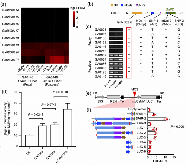 作者對關(guān)聯(lián)區(qū)域內(nèi)8個基因的表達(dá)模式分析,發(fā)現(xiàn)在短絨發(fā)育起始階段,無絨材料中GaFZ基因表達(dá)顯著高于短絨材料(圖3a);從GWAS群體中隨機(jī)挑選各6個短絨和無絨材料進(jìn)行基因和啟動子序列分析,發(fā)現(xiàn)larINDELFZ存在于所有的無絨材料中(圖3b, c);熒光素酶活性分析實驗結(jié)果表明,larINDELFZ可能扮演遠(yuǎn)端增強(qiáng)子角色特異激活其下游短絨發(fā)育關(guān)鍵基因的GaFZ?表達(dá)(圖3d, e)