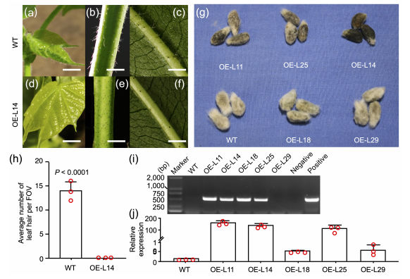 為了進(jìn)一步驗證GaFZ基因的功能,作者分別在擬南芥和有短絨的陸地棉中過表達(dá)GaFZ基因,發(fā)現(xiàn)轉(zhuǎn)基因擬南芥葉茸毛的發(fā)育收到了明顯的抑制,同時轉(zhuǎn)基因棉花株系的莖毛、葉茸毛和短絨的發(fā)育也均受到了不同程度的抑制(圖a-h);但是,轉(zhuǎn)基因棉花和擬南芥中根毛的數(shù)量均沒有發(fā)生變化;qRT-PCR分析顯示,過表達(dá)株系中GaFZ基因顯著高于野生型(圖4i-j);結(jié)果表明,GaFZ基因可以抑制葉茸毛和短絨纖維的發(fā)育,而對根毛的發(fā)育沒有抑制作用。