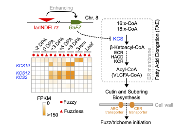 本研究通過對215份亞洲棉自然群體的種子短絨和無茸毛性狀進(jìn)行全基因組關(guān)聯(lián)分析(GWAS),鑒定得到位于A08染色體末端的一個長度為6.2 kb的插入片段與短絨和葉茸毛表型顯著相關(guān),并發(fā)現(xiàn)該片段可能扮演遠(yuǎn)端增強(qiáng)子角色,可以特異激活其下游短絨發(fā)育關(guān)鍵基因GaFZ的表達(dá)。同時,在擬南芥和陸地棉中過表達(dá)GaFZ基因,發(fā)現(xiàn)GaFZ基因負(fù)調(diào)控短絨和葉茸毛的發(fā)育。進(jìn)一步共表達(dá)和互作分析顯示,GaFZ基因可能通過抑制超長鏈脂肪酸伸長途徑中的基因表達(dá)來影響短絨和葉茸毛的發(fā)育。
