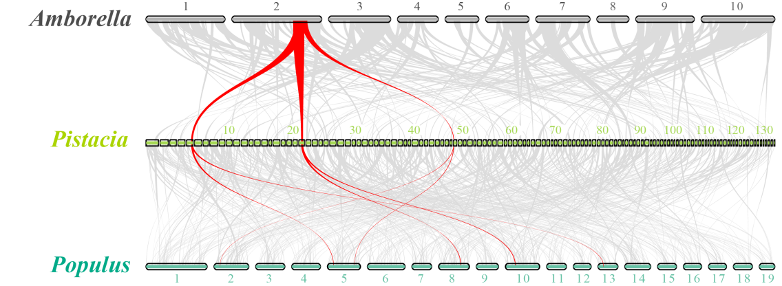 如2019年百邁客合作發(fā)表于《Genome Biology》開心果基因組文章事例所示:每個無油樟區(qū)域?qū)?yīng)三個開心果區(qū)域,每個開心果區(qū)域?qū)?yīng)有兩個毛果楊區(qū)域,暗示了開心果在毛果楊之外又發(fā)生了一次獨立的復(fù)制事件。