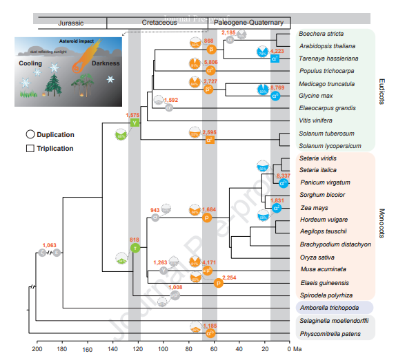 多倍化(polyploidy)或全基因組加倍(whole genome duplication, WGD)事件使基因組內(nèi)的所有基因都發(fā)生重復(fù),為生物進化提供了原始的遺傳材料,被認為是進化的加速器。全基因組復(fù)制事件在真菌或動植物中都有發(fā)生,是基因組中基因數(shù)量變化、基因新功能的形成、基因重排等的重要推動力。