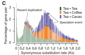 KS:全基因組加倍事件會產(chǎn)生大量的同源基因,反映在Ks值上便是會有大量的Ks值接近的同源基因?qū)Φ漠a(chǎn)生,Ks值峰就對應(yīng)了全基因組加倍事件的存在。