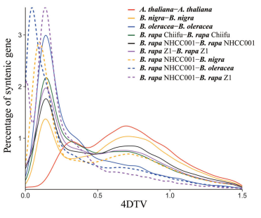 由于在同一基因組上共線性的染色體片段中有旁系同源的基因集,因此可以通過這些成對的共線性片段追溯目的物種曾經(jīng)的復(fù)制事件。通過研究全基因組復(fù)制事件,可以確定物種發(fā)生全基因組倍增時間,同時也通過分化時間的比對來判斷復(fù)制是發(fā)生在分化之前還是分化之后。常用方式:KS/4DTV