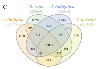 基因家族(gene family),是來源于同一個祖先,由一個基因通過基因重復(fù)而產(chǎn)生兩個或更多的拷貝而構(gòu)成的一組基因,它們在結(jié)構(gòu)和功能上具有明顯的相似性,編碼相似的蛋白質(zhì)產(chǎn)物。對物種的蛋白序列進行家族分類,對獲得基因家族進行注釋;對本物種的特有基因家族進行GO和KEGG富集分析。物種共有基因家族中的單拷貝同源基因數(shù)目,用于系統(tǒng)發(fā)育樹的構(gòu)建等分析。Veen圖中非重疊區(qū)與重疊區(qū)的數(shù)量分別表示幾個物種間特有基因家族和共有基因家族的數(shù)量。