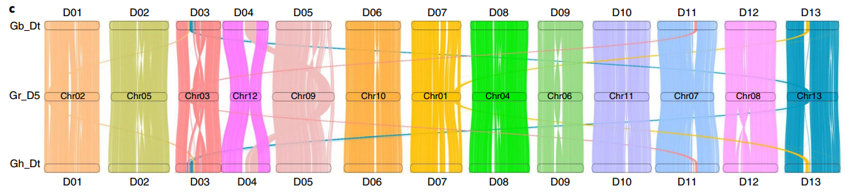 如2018年百邁客合作發(fā)表于《Nature Genetics》陸地棉與海島棉基因組文章圖例所示:海島棉染色體D05和陸地棉D(zhuǎn)12中均存在大的染色體臂間倒位,暗示這些變異出現(xiàn)在多倍化之后;兩個四倍體相對于G. raimondii共有一些結(jié)構(gòu)變異,例如染色體D09中兩個四倍體發(fā)生了大的反轉(zhuǎn)。?
