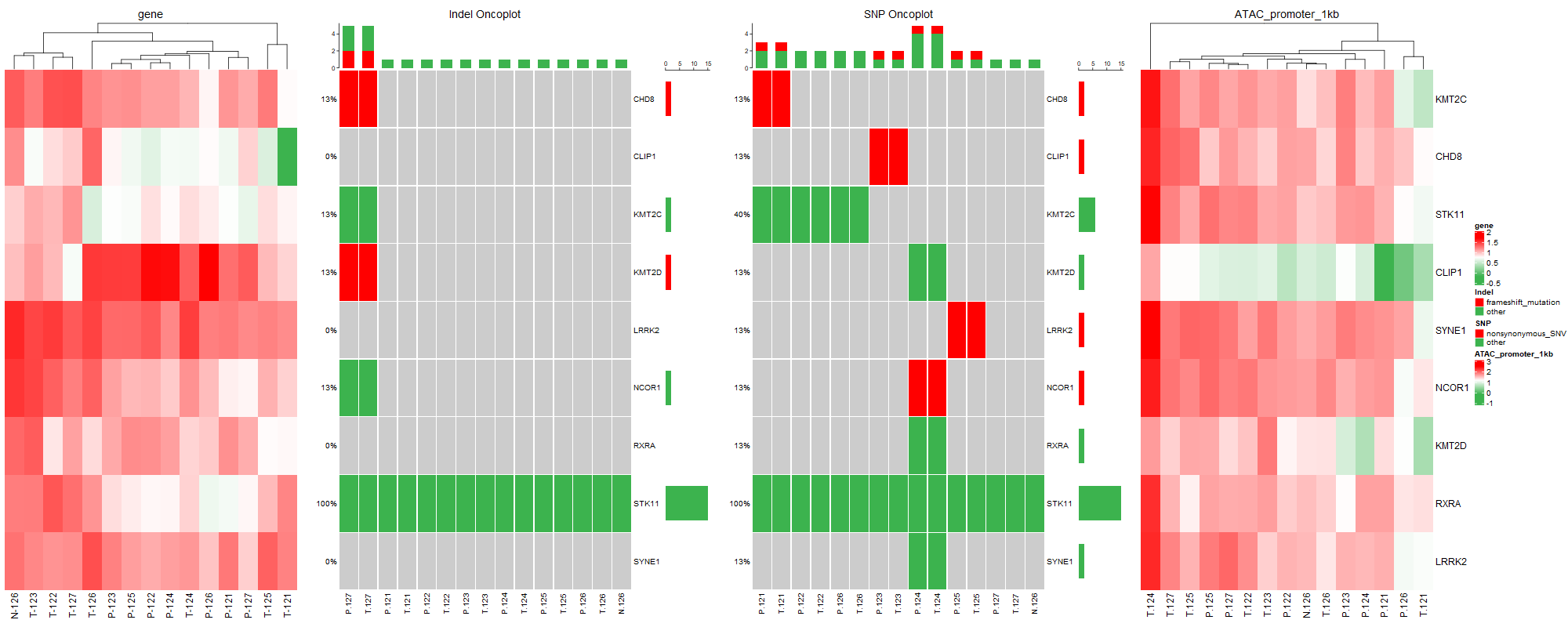 其中需要注意的是當(dāng)有多個(gè)基因瀑布圖時(shí),alter_fun和col需在同一條命令中設(shè)置。通過(guò)以上一頓操作,快速將基因瀑布圖和熱圖組合在一起,既展示了基因的結(jié)構(gòu)變異、開放狀態(tài)、基因表達(dá),呈現(xiàn)多組學(xué)的角度探討疾病發(fā)生發(fā)展。這不就完成了Fig1還升華了Fig1的深度。