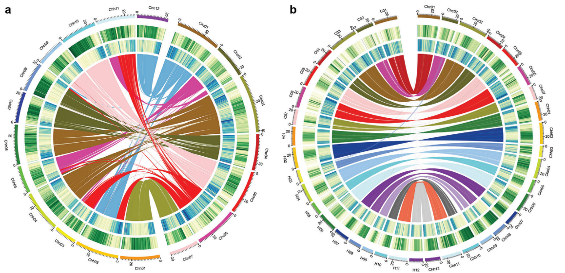 作者通過(guò)PacBio+BioNano+Hi-C+Illumina共組裝獲得530.8?Mb基因組(≈67%流式評(píng)估大小;≈77% survey評(píng)估大?。槐葘?duì)發(fā)現(xiàn)未裝出的為重復(fù)序列),contig N50=6.5?Mb,并將組裝的基因組序列掛載至19條假染色體上(掛載率97.23%;定序與定向率93.33%)(表1)。通過(guò)與二倍體C.sativus (CC)和C.hystrix(HH)染色體的C01–C07和H01–H12對(duì)應(yīng),將C.×hytivus染色體命名為Chc01–Chc07和Chh01–Chh12(圖1)。