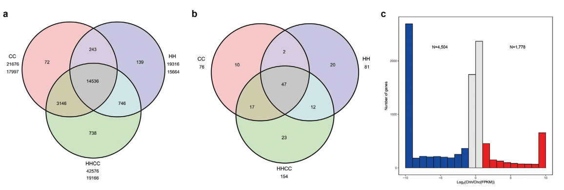 作者將C.×hytivus(S14)基因組分為Chc(203.36 Mb)和Chh(287.37 Mb)兩個(gè)亞基因組,這兩個(gè)亞基因組均小于相應(yīng)的CC基因組(226.21 Mb)和HH基因組(297.49 Mb),分別包含的基因也比相應(yīng)的親本種少。與CC相比,在Chh亞基因組中檢測(cè)到的SVs更多,并且基因丟失更多。通過(guò)序列深度分析及同源交換(HE)分析表明,在C.×hytivus(S14)基因組中分別丟失11個(gè)CC和146個(gè)HH基因,同時(shí)更多的HH序列被CC序列替換。共線性基因?qū)υ?em>C.×hytivus(S14)亞基因組中的表達(dá)結(jié)果表明,CC顯性基因的數(shù)量明顯多于HH顯性基因(圖2C)。這些結(jié)果表明Chc亞基因組可能比Chh亞基因組更占優(yōu)勢(shì)。CC和Chc亞基因組的TE含量低于HH和Chh亞基因組,支持了由祖先細(xì)胞基因組中TE的差異密度驅(qū)動(dòng)異源多倍體中亞基因組偏向分化的假說(shuō)(TEs的失活擴(kuò)散到附近的基因,TEs密度大的同源基因組的整體表達(dá)較弱,導(dǎo)致基因失活和最終丟失的可能性更大)。