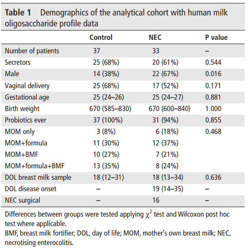 目的:壞死性小腸結(jié)腸炎(NEC)是一種影響早產(chǎn)兒的嚴重腸道疾病。人們對其潛在機制知之甚少:母親自己的母乳(MOM)具有保護性,可能與母乳寡糖(HMO)和嬰兒腸道微生物相互作用。作者研究了HMO和嬰兒腸道微生物組發(fā)育之間的相互作用及其與NEC之間的關(guān)系。設(shè)計:作者對33例NEC患兒和37例對照母乳中的母乳寡糖進行了分析。對48名嬰兒(含14例NEC患兒)糞便進行了縱向宏基因組測序(n=644)。