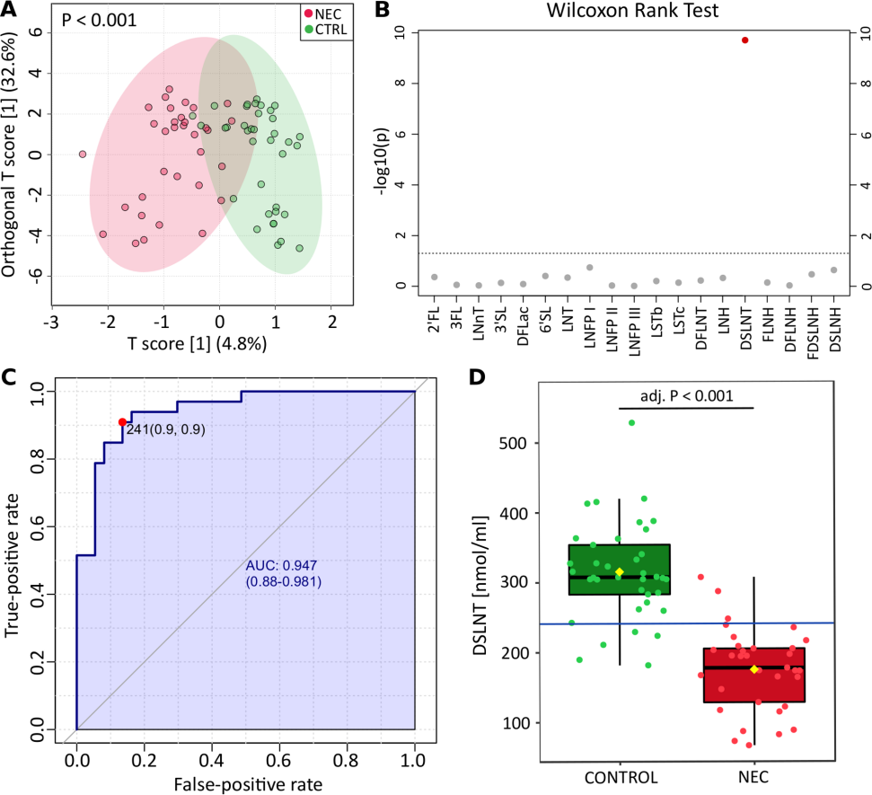 考慮到較低的DSLNT與NEC相關(guān)而不受分泌狀態(tài)的影響,作者探討了HMO作為NEC發(fā)育的生物標志物的用途。單因素ROC曲線分析表明,241nmol/ml是MOM中DSLNT鑒別NEC和對照嬰兒的最佳濃度(圖1C和D)。AUC值為0.947,靈敏度為0.9,特異性為0.9。