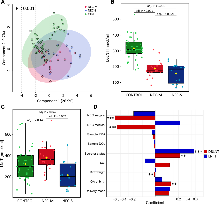 作者隨后通過調(diào)整線性模型研究了DSLNT和LNnT濃度與臨床變量之間的潛在關(guān)聯(lián)。DSLNT與兩種疾病類型呈負相關(guān),NEC-M的系數(shù)值為-0.60,NEC-S的系數(shù)值為-0.67(圖2D)。然而根據(jù)調(diào)整后的線性模型LNnT與疾病類型無關(guān)。分泌型母親中DSLNT和LNnT均顯著較高。母親的DSLNT與胎齡呈正相關(guān),與出生體重呈負相關(guān)。HMO與母親性別、分娩方式、胎齡和DOL均無相關(guān)性(圖2D)。