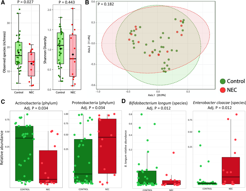 作者納入了含有HMO數(shù)據(jù)的嬰兒的糞便微生物組數(shù)據(jù),進行獨立研究獲得宏基因組測序數(shù)據(jù)。14例NEC患兒和34例對照組的644個糞便樣本。NEC患兒物種豐富度顯著降低,shannon指數(shù)差異不顯著(圖3A)。PCoA分析顯示NEC和對照之間細菌菌群結(jié)構(gòu)差異不大(圖3B)。門水平分析顯示,相比于對照組NEC患兒Actinobacteria 相對豐度顯著降低,Proteobacteria 相對豐度顯著升高(圖3C)。種水平分析相比于對照組NEC患兒B. longum相對豐度降低,Enterobacter cloacae相對豐度升高(圖3D)。