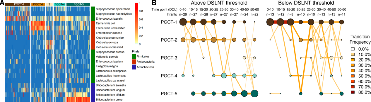 采用種水平數(shù)據(jù)對PGCTs進行DMM聚類,5種PCGTs最理想(圖4A)。PGCT-1特征菌是高豐度Staphylococcus?spp和Enterococcus faecalis,PGCT-2高豐度Escherichia?spp,PGCT-3高豐度Klebsiella?spp,PGCT-4和PGCT-5高豐度Bifidobacterium?spp,B. breve在PGCT-5豐度高。根據(jù)樣本在所有時間點和clusters上的分布,在出生后前70天內(nèi)接受MOM中DSLNT高于和低于241nmol/ml的嬰兒微生物組差異顯著(圖4B)。在校正組間抽樣頻率不均勻后,最后一個時間點接受MOM超過DSLNT閾值2倍的嬰兒類似于PGCT-5,其Bifidobacterium高豐度(圖4A)。
