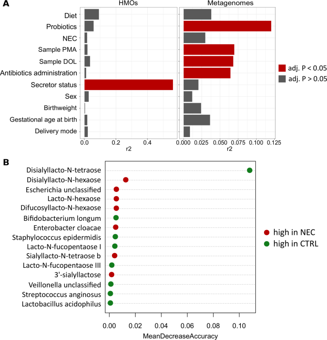結(jié)果:相比對照組,NEC患兒母親母乳中HMO和DSLNT濃度顯著降低。MOM閾值為241nmol/ml對NEC的敏感性和特異性為0.9。NEC發(fā)病前的宏基因組測序顯示,NEC患兒Bifidobacterium longum相對豐度降低,Enterobacter cloacae相對豐度升高。低MOM DSLNT影響微生物組的縱向發(fā)展,這與過渡到以雙歧桿菌為主的早產(chǎn)兒腸道菌群類型的減少有關(guān),通常在年齡大一些的嬰兒中觀察到。疾病前HMO和宏基因組數(shù)據(jù)結(jié)合隨機森林分析區(qū)分嬰兒健康或是NEC準確度為87.5%。
