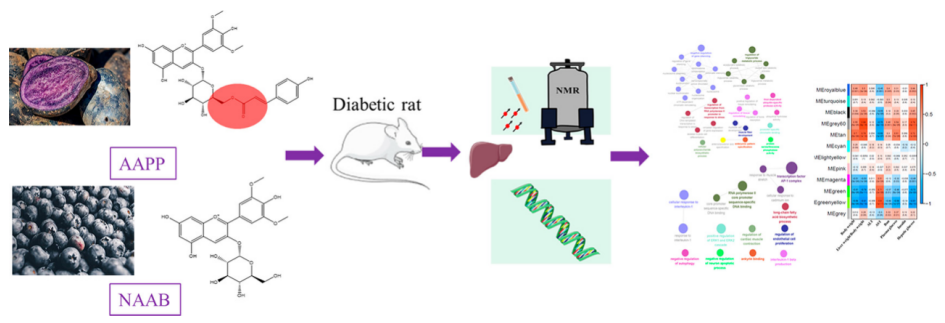 花色苷是植物中的一大類多酚化合物,目前已知是對氧化應(yīng)激、炎癥和能量穩(wěn)態(tài)有調(diào)節(jié)作用。已有報道發(fā)現(xiàn)花色苷具有抗糖尿病的療效?;ㄉ盏暮诵慕Y(jié)構(gòu)是花青苷,它可以糖基化形成非?;幕ㄇ嘬?,糖苷可以?;笮纬甚;幕ㄇ嘬铡G易罱醒芯勘砻?,與未酰化的花青苷相比,酰化花青苷具有更好的穩(wěn)定性和抗氧化活性。本研究利用全長轉(zhuǎn)錄組學(xué)和核磁共振代謝組學(xué)方法,比較了非酰化和?;ㄉ諏μ悄虿〈笫蟾闻K基因表達(dá)和代謝的影響。這是第一次綜合應(yīng)用這兩種強大的技術(shù)來研究肝臟基因表達(dá)和代謝產(chǎn)物的變化。