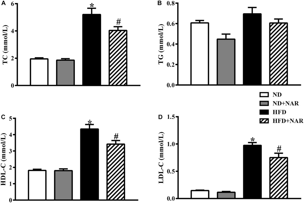 試驗材料:6周齡雄性C57BL/6J小鼠,ND組n=10,ND+NAR組n=10,HFD組n=10和HFD+NAR組n=10。
