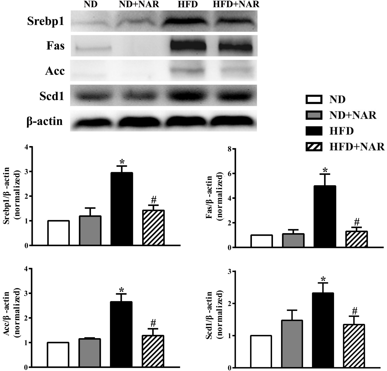 圖4 NAR對高脂小鼠肝臟脂肪生成相關(guān)蛋白表達的影響