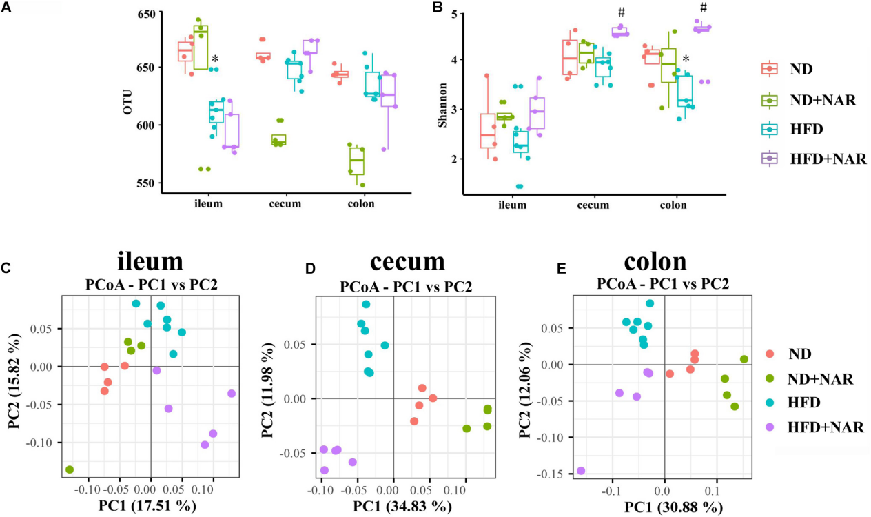 除HFD組回腸、盲腸和結(jié)腸的OTUs較ND組降低外,4組腸道不同部位的細菌OTUs無明顯差異(圖5A)。添加NAR降低了ND組小鼠盲腸和結(jié)腸OTUs。Shannon多樣性結(jié)果表明,高脂飼喂降低了結(jié)腸細菌多樣性,而NAR增加了盲腸和結(jié)腸細菌多樣性(圖5B)。高脂飼喂和NAR對回腸細菌多樣性沒有影響。