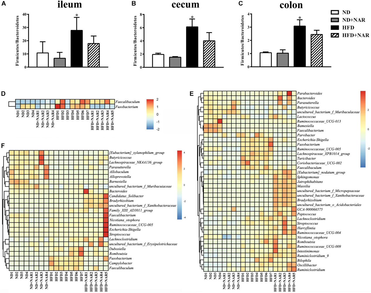 PCoA分析顯示,各處理組回腸、盲腸和結(jié)腸中細菌組成具有明顯差異(圖5C-E)。與ND組相比,HFD增加了厚壁菌門/擬桿菌門(Firmicutes/Bacteroidetes)比值,HFD+NAR組NAR增加了厚壁菌門/擬桿菌門比值(圖6A-C)。因此NAR影響了腸道菌群組成。