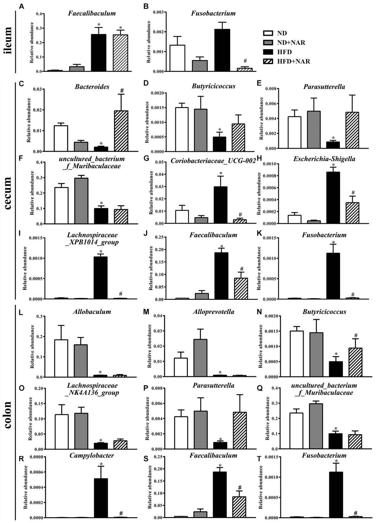 優(yōu)勢菌屬和差異菌屬熱圖顯示,補充NAR改變了HFD誘導(dǎo)的腸道細菌變化(圖6D-F)。與ND組相比,HFD組盲腸中Coriobacteriaceae_UCG-002、Escherichia-Shigella、Faecalibaculum、Fusobacterium、Lachnospiraceae_XPB1014_group、Parvibacter、Ruminococcaceae_UCG-005和Turicibacter相對豐度較高,Campylobacter、Dubosiella、Faecalibaculum和Fusobacterium在結(jié)腸中相對豐度較高,Bacteroides在盲腸中相對豐度較低,Butyricicoccus在結(jié)腸中相對豐度較低。NAR處理逆轉(zhuǎn)了這些效果。與ND組相比HFD飼喂小鼠腸道菌群顯示Butyricicoccus、Parasutterella和uncultured_bacterium_f_Muribaculaceae在盲腸中相對豐度較低,Allobaculum、Alloprevotella、Lachnospiraceae_NK4A136_group、Parasutterella和uncultured_bacterium_f_Muribaculaceae在結(jié)腸中相對豐度較低,F(xiàn)aecalibaculum在回腸中相對豐度較高。HFD+NAR組Bradyrhizobium、[Eubacterium]_nodatum_group、GCA-900066575、Jatrophihabitans、Massilia、Peptococcus、Sphingomonas、uncultured_bacterium_o_Acidobacteriales、uncultured_bacterium_f_Micropepsaceae和uncultured_bacterium_f_Xanthobacteraceae在盲腸中相對豐度較高,Bacteroides、Bradyrhizobium、Candidatus_Solibacter和 uncultured_bacterium_f_Xanthobacteraceae在結(jié)腸中相對豐度較高,F(xiàn)usobacterium在回腸中相對豐度較低。圖7為相對豐度改變的細菌統(tǒng)計結(jié)果,這些結(jié)果表明NAR調(diào)節(jié)了HFD小鼠腸道細菌。