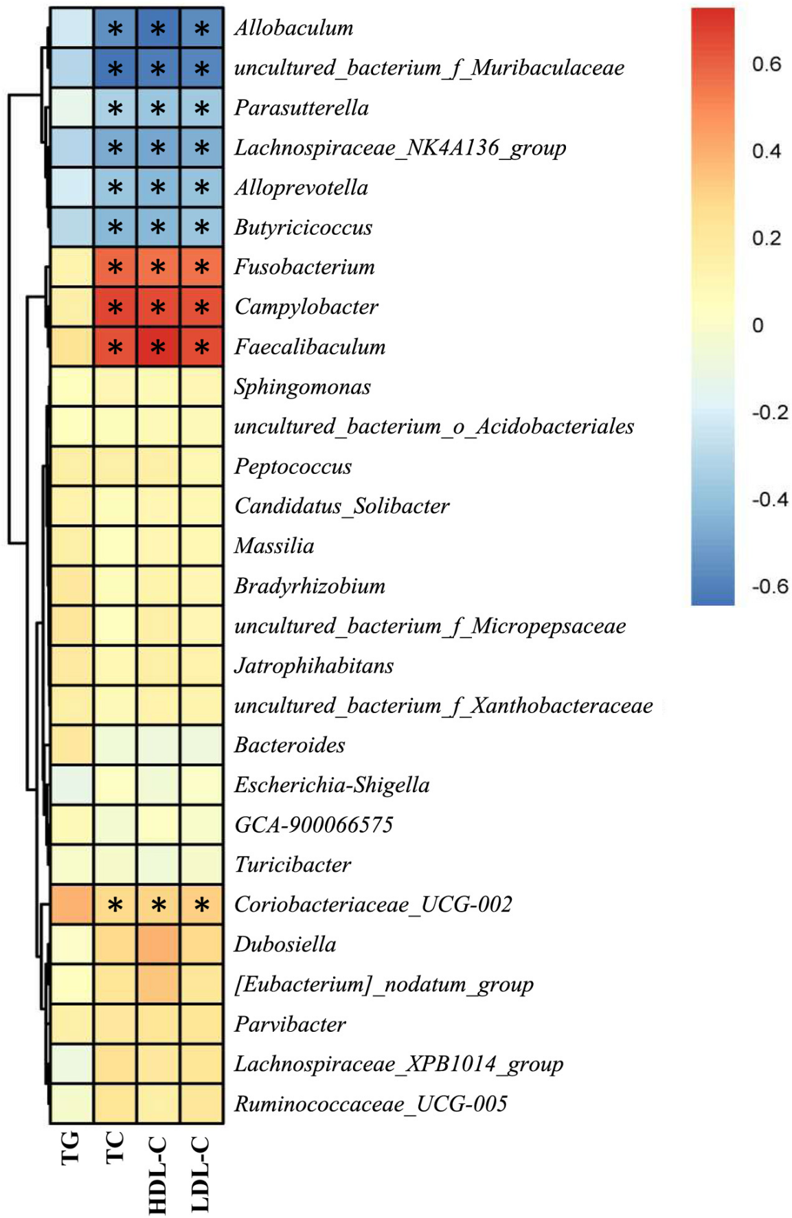 血清TC、HDL-C和LDL-C水平與細菌菌屬的相對豐度有關(guān),Allobaculum、Alloprevotella、Butyricicoccus、Lachnospiraceae_NK4A136_group、Parasutterella和uncultured_bacterium_f_Muribaculaceae與血脂水平呈負相關(guān),Campylobacter、 Coriobacteriaceae_UCG-002、Faecalibaculum和Fusobacterium與血脂呈正相關(guān)(圖8)。