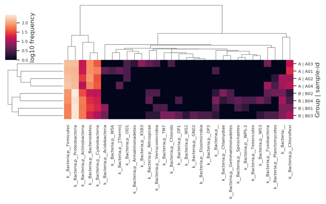 物種豐度聚類熱圖:以顏色梯度來代表數(shù)據(jù)矩陣中數(shù)值的大小并根據(jù)物種或樣品豐度相似性進行聚類的一種圖形展示方式。將高豐度和低豐度的物種分塊聚集,通過顏色梯度及相似程度來反映多個樣品群落組成的相似性和差異性。