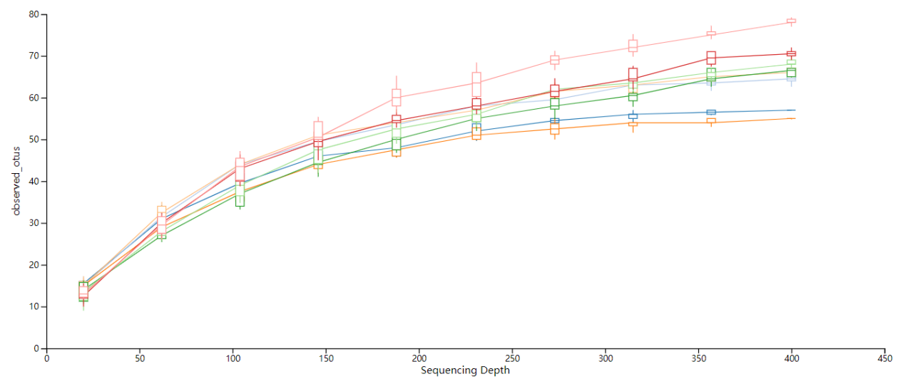 稀釋性分析:用于驗證測序數(shù)據(jù)量是否足以反映樣品中的物種多樣性,并間接反映樣品中物種的豐富程度。在一定范圍內,隨著測序條數(shù)的加大,若曲線表現(xiàn)為急劇上升則表示群落中有大量物種被發(fā)現(xiàn);當曲線趨于平緩,則表示此環(huán)境中的物種并不會隨測序數(shù)量的增加而顯著增多