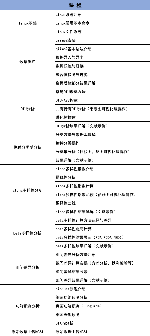 想學習如何分析微生物多樣性數(shù)據(jù)?想了解每步操作參數(shù)的意義?百邁客針對老師們對微生物多樣性內容的需求,特開辦微生物多樣性生信課程,面向全體科研工作者,系統(tǒng)學習微生物多樣性分析中常規(guī)內容與分析過程。課程設計覆蓋linux基本操作、QIIME2數(shù)據(jù)分析、百邁客云分析三部分內容。