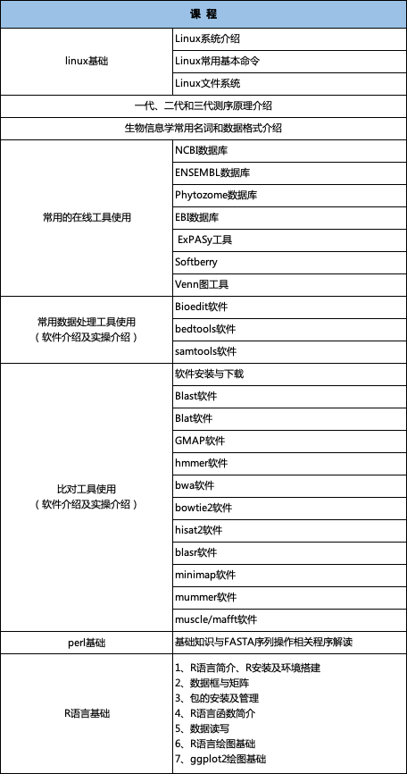 本課程主要針對沒有接觸過生信,而且沒有具體學(xué)習(xí)的生信方向,想了解入門生信的同學(xué)們。涉及生信入門基礎(chǔ)的了解知識、常用在線工具、以及R、linux和Perl的語言基礎(chǔ)介紹,讓你了解生信大概內(nèi)容,從而根據(jù)這些內(nèi)容了解自己想學(xué)習(xí)的方向,進而一步步細化去學(xué)習(xí)研究。