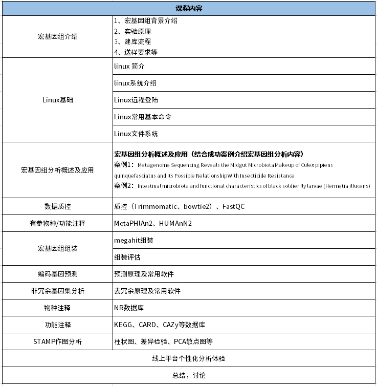 本課程從宏基因組背景介紹、實(shí)驗(yàn)(實(shí)驗(yàn)測(cè)序原理、建庫(kù)方法和流程、送樣注意事項(xiàng)等)、分析(下機(jī)數(shù)據(jù)質(zhì)控、有參注釋、無(wú)參組裝/預(yù)測(cè)/物種注釋/功能注釋等)、可視化作圖,讓您全面了解宏基因組分析每個(gè)過(guò)程,并結(jié)合案例文章,讓您了解宏基因組文章思路,助力科學(xué)研究。