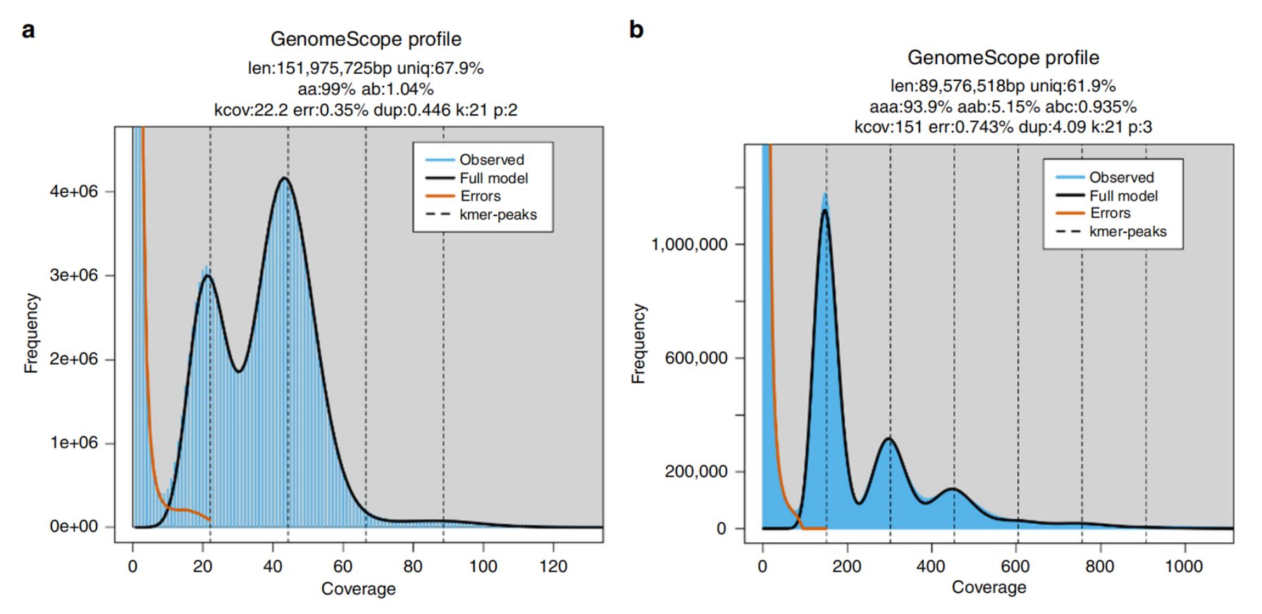 一個(gè)物種基因組組裝質(zhì)量的好壞,其中一個(gè)重要指標(biāo)就是看組裝的大小是否符合這個(gè)物種的預(yù)估值。偏大可能是存在冗余,需要進(jìn)行片段取舍;若偏小,可能是組裝的片段缺失;無(wú)論哪種都不利于后續(xù)基因組的應(yīng)用。而預(yù)估物種基因組大小的主流方法有兩種:①流式細(xì)胞儀測(cè)定DNA含量;②基于測(cè)序片段統(tǒng)計(jì)計(jì)算基因組大小,也就是Survey調(diào)研圖分析。survey以二代測(cè)序技術(shù)為基礎(chǔ),基于小片段文庫(kù)進(jìn)行低深度測(cè)序,通過(guò)K-mer分析,快速獲得基因組大小、雜合度、重復(fù)序列比例等基本信息。為制定該物種的全基因組de novo測(cè)序策略提供有效依據(jù)。原理詳見(jiàn)往期介紹:什么是基因組Survey?為什么要做基因組Survey?
