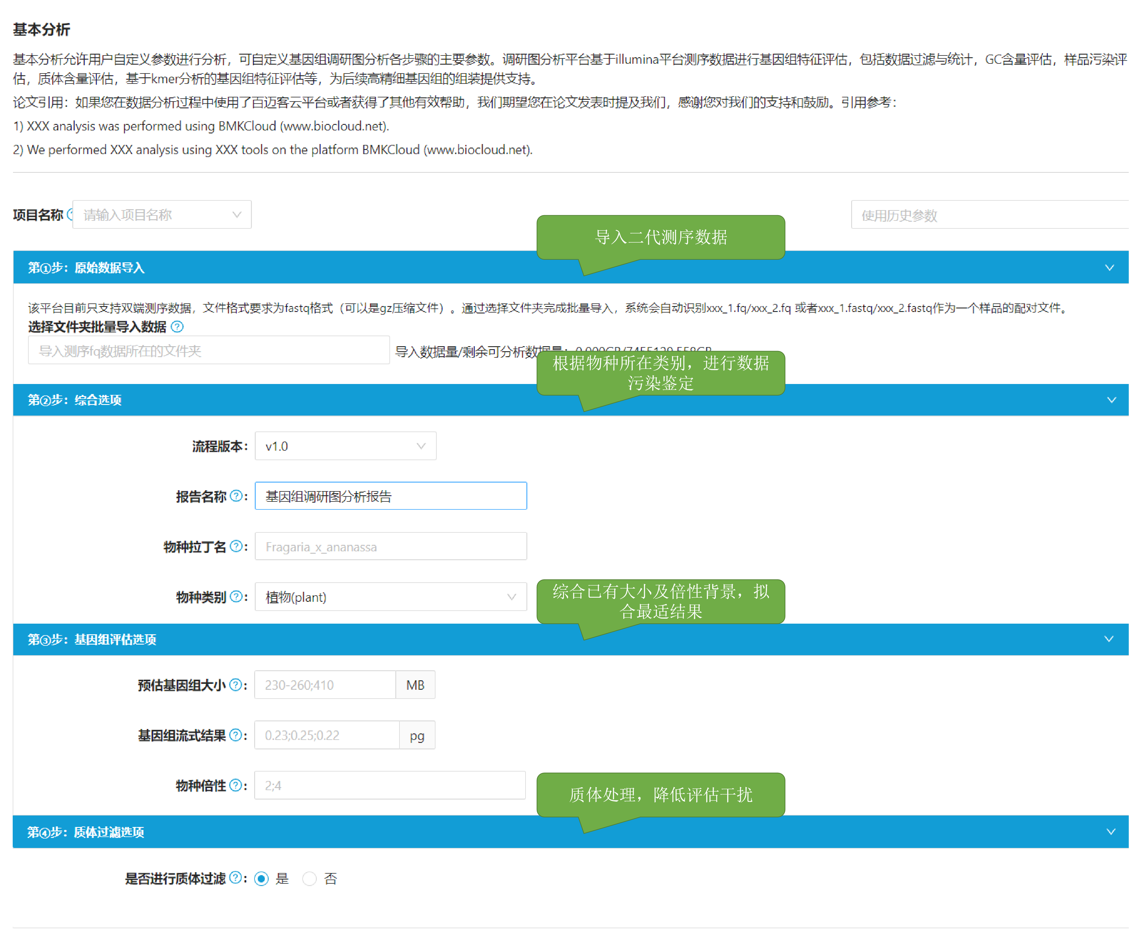 b.為了更好區(qū)分所分析項(xiàng)目,可自主填寫(xiě)報(bào)告名稱(chēng)和物種拉丁名(選填)。動(dòng)植物材料選取過(guò)程中易受到微生物或其他生物污染,因此通過(guò)選擇分析物種所在類(lèi)別,進(jìn)行應(yīng)數(shù)據(jù)庫(kù)比對(duì)判斷污染情況。物種污染程度為材料可用性提供重要依據(jù)。
