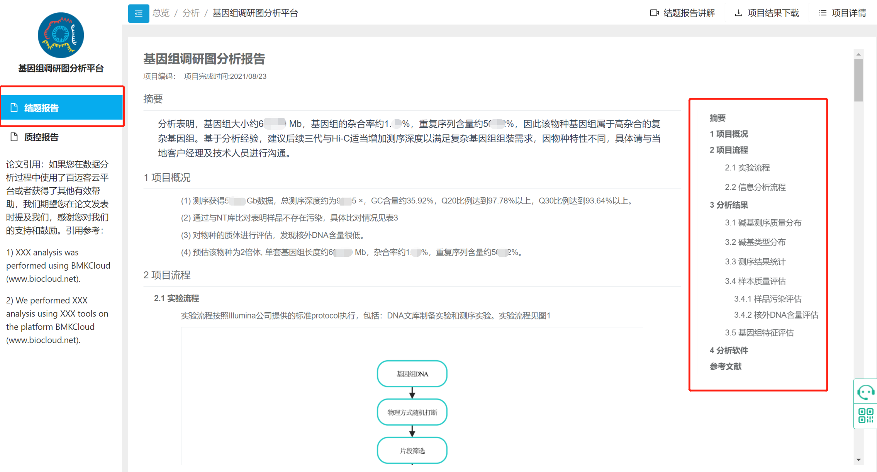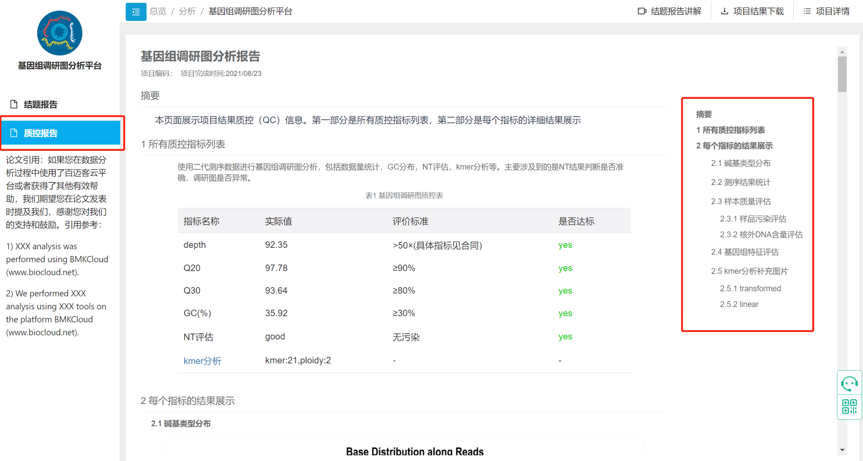 分析完成即可在線(xiàn)查看項(xiàng)目結(jié)題報(bào)告與數(shù)據(jù)質(zhì)控報(bào)告。報(bào)告將對(duì)整體數(shù)據(jù)質(zhì)量、污染評(píng)估、基因組特征、使用軟件版本等進(jìn)行詳細(xì)描述。具體可見(jiàn)下圖右部目錄。