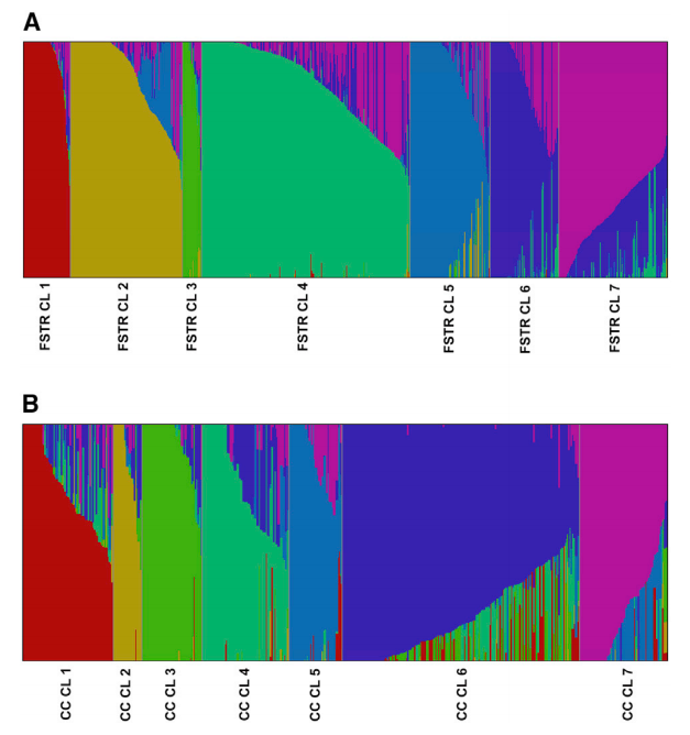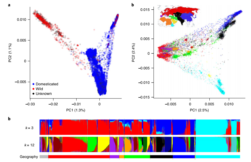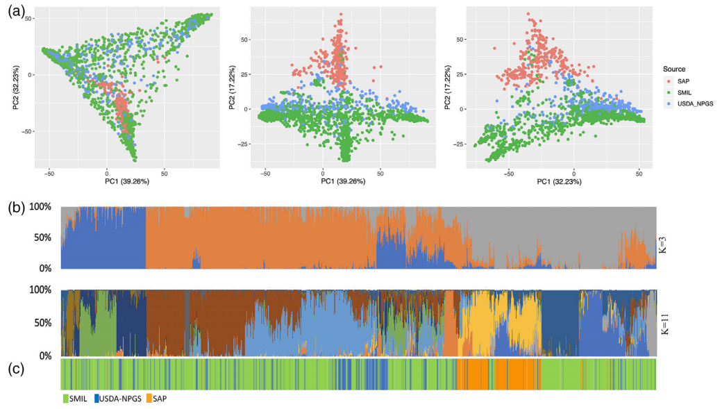 基因庫(kù)收集和保存大量植物和詳細(xì)的護(hù)照信息,目的是保護(hù)遺傳多樣性以進(jìn)行保護(hù)和育種。此類集合的遺傳表征有可能闡明重要作物的遺傳歷史,使用標(biāo)記-性狀關(guān)聯(lián)來鑒定感興趣性狀的位點(diǎn),尋找正在進(jìn)行選擇的位點(diǎn),并通過識(shí)別分類錯(cuò)配和重復(fù)為基因庫(kù)管理作出貢獻(xiàn)。本研究通過GBS測(cè)序?qū)碜匀蚧驇?kù)的10,038個(gè)辣椒 (Capsicum spp.) 種質(zhì)進(jìn)行基因分型,并調(diào)查了這種標(biāo)志性主食的近期歷史?;赟NP數(shù)據(jù)計(jì)算了identity-by-state (IBS) 比例,在基因庫(kù)內(nèi)和基因庫(kù)之間檢測(cè)到多達(dá) 1,618 個(gè)重復(fù)種質(zhì)。進(jìn)一步深入分析了常見食用辣椒的遺傳多樣性以調(diào)查其歷史,發(fā)現(xiàn)在全球廣泛地區(qū)收集的辣椒種類有很大的重疊。GWAS分析和選擇清除分析發(fā)現(xiàn)辣椒性狀,如刺激性,這些性狀在全球分布不均勻,表明人類偏好對(duì)馴化辣椒的遺傳結(jié)構(gòu)產(chǎn)生了主要影響。