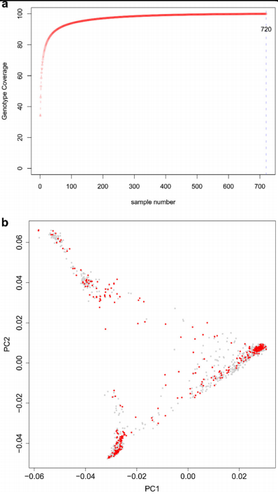 遺傳多樣性為植物育種和遺傳研究奠定了基礎(chǔ)。3K水稻基因組 (3KRG) 項(xiàng)目對(duì)3000多個(gè)水稻基因組進(jìn)行了測(cè)序。本研究新增了四個(gè)印度水稻品種以創(chuàng)建一個(gè)包含3004個(gè)水稻品種的群體。但是如此多的種質(zhì)資源難以保存和評(píng)估。構(gòu)建核心和微核心種質(zhì)是遺傳資源管理的有效方法。因此,本研究開發(fā)了一個(gè)包含 520 個(gè)種質(zhì)的微核心種質(zhì)集,它捕獲了大部分SNP并代表了原始種質(zhì)資源群體中的所有表型和地理區(qū)域。微核心種質(zhì)集使用不同的統(tǒng)計(jì)分析進(jìn)行了驗(yàn)證,并包含來自所有主要水稻的代表,包括粳稻、秈稻、aus/boro 和印度香米等。微核心種質(zhì)集的全基因組關(guān)聯(lián)分析有效地復(fù)現(xiàn)了原始群體中確定的標(biāo)記-性狀關(guān)聯(lián)。單倍型分析驗(yàn)證了微核心種質(zhì)集的實(shí)用性。本研究中開發(fā)的水稻微核心種質(zhì)集對(duì)于農(nóng)藝性狀評(píng)估和通過標(biāo)記輔助分子育種進(jìn)行的水稻改良具有重要價(jià)值。