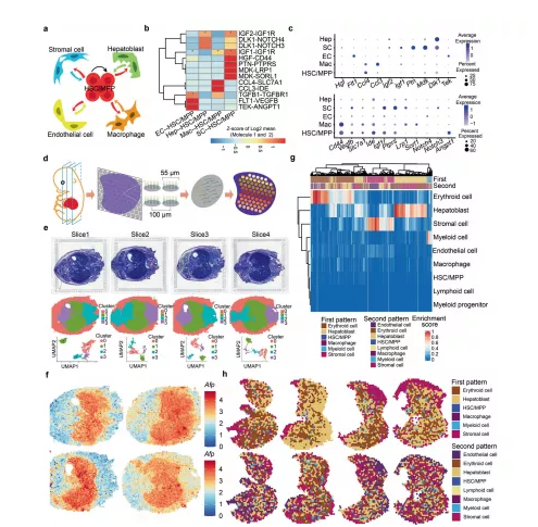 a示意圖展示 HSC/MPP 和生態(tài)位細胞(內皮細胞、基質細胞、成肝細胞和巨噬細胞)之間的細胞相互作用。b CellPhoneDB 分析展示主要的 HSC/MPP-生態(tài)位細胞相互作用對。c主要的HSC/MPP-生態(tài)位細胞相互作用對的配體(頂部)和相應受體(底部)表達模式的散點圖。d 10×Visium ST 實驗流程示意圖。e E14.5 胚胎組織切片的蘇木精和伊紅 (HE) 染色。f組織切片中成肝細胞標記物Afp 的表達模式。g熱圖展示了FL斑點的富集分數。h FL部分空間特征圖。